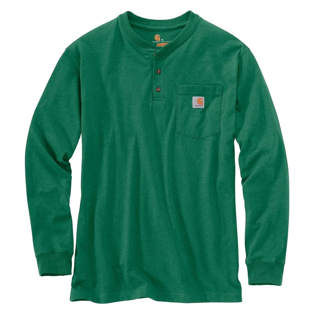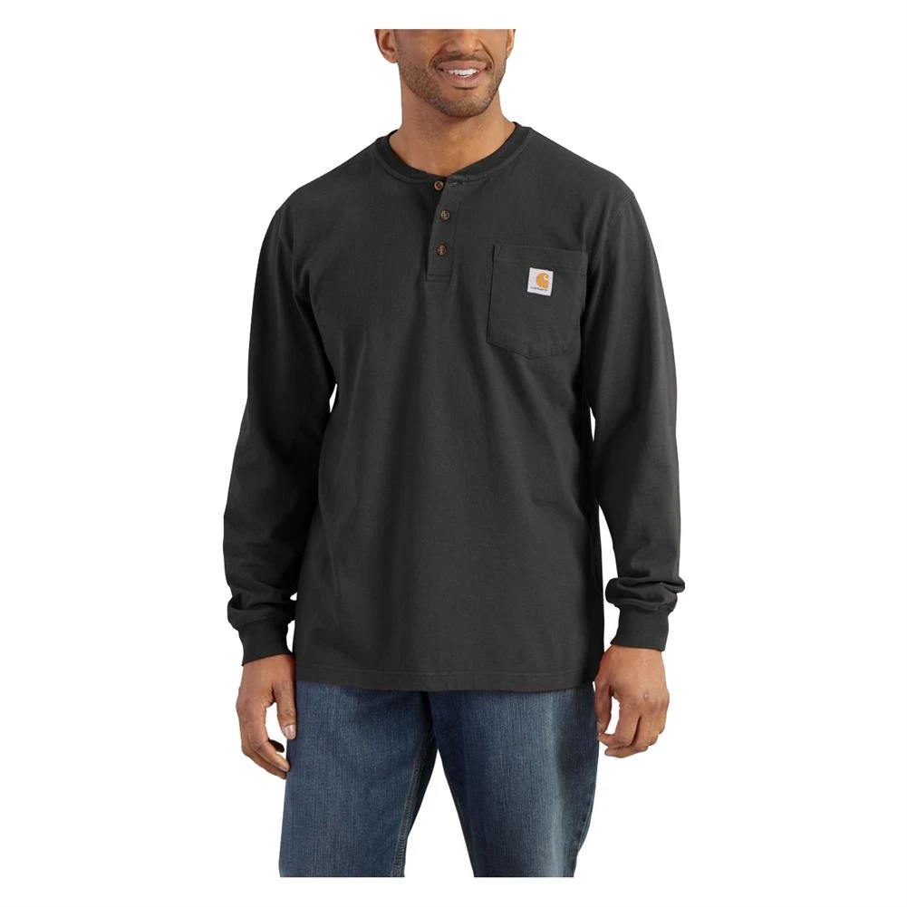The Carhartt Long Sleeve Workwear Pocket Henley delivers non-stop comfort and durability on the job. Made with ultra-soft 100% cotton jersey knit, this shirt uses a side-seamed construction to minimize twisting, and features a rib-knit collar and cuffs for a comfortable fit. The tagless neck label eliminates the skin irritation caused by ordinary neck tags. On the front of the shirt, a left chest pocket with a sewn-on Carhartt label keeps small accessories close at hand. Designed with a three-button front placket for a sharp look, this long sleeve shirt keeps you comfortable throughout the toughest jobs without limiting your performance.